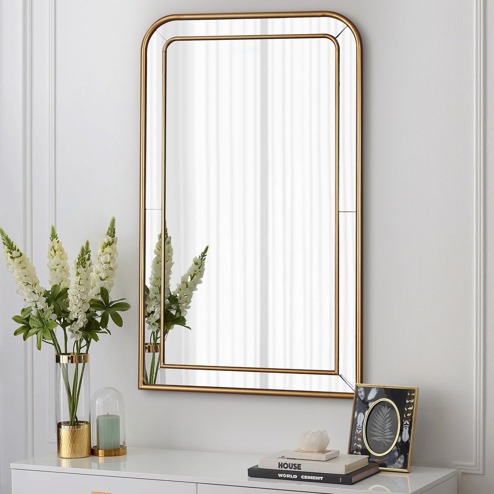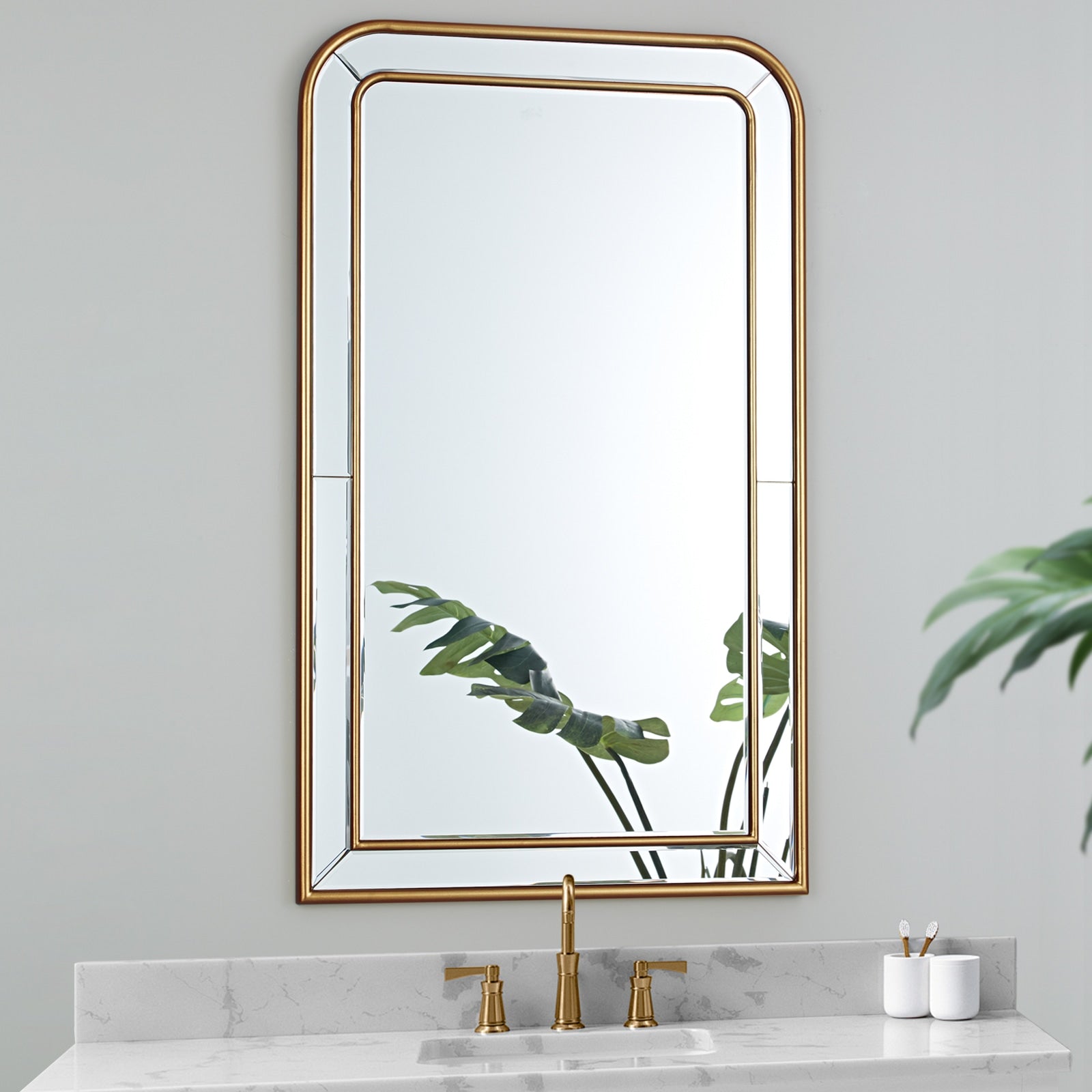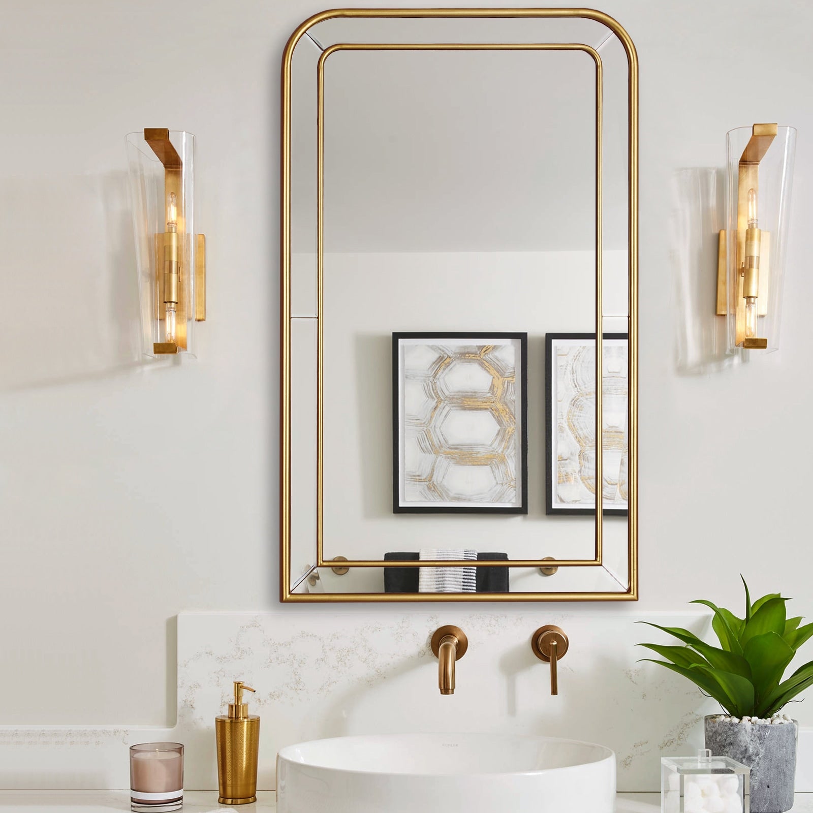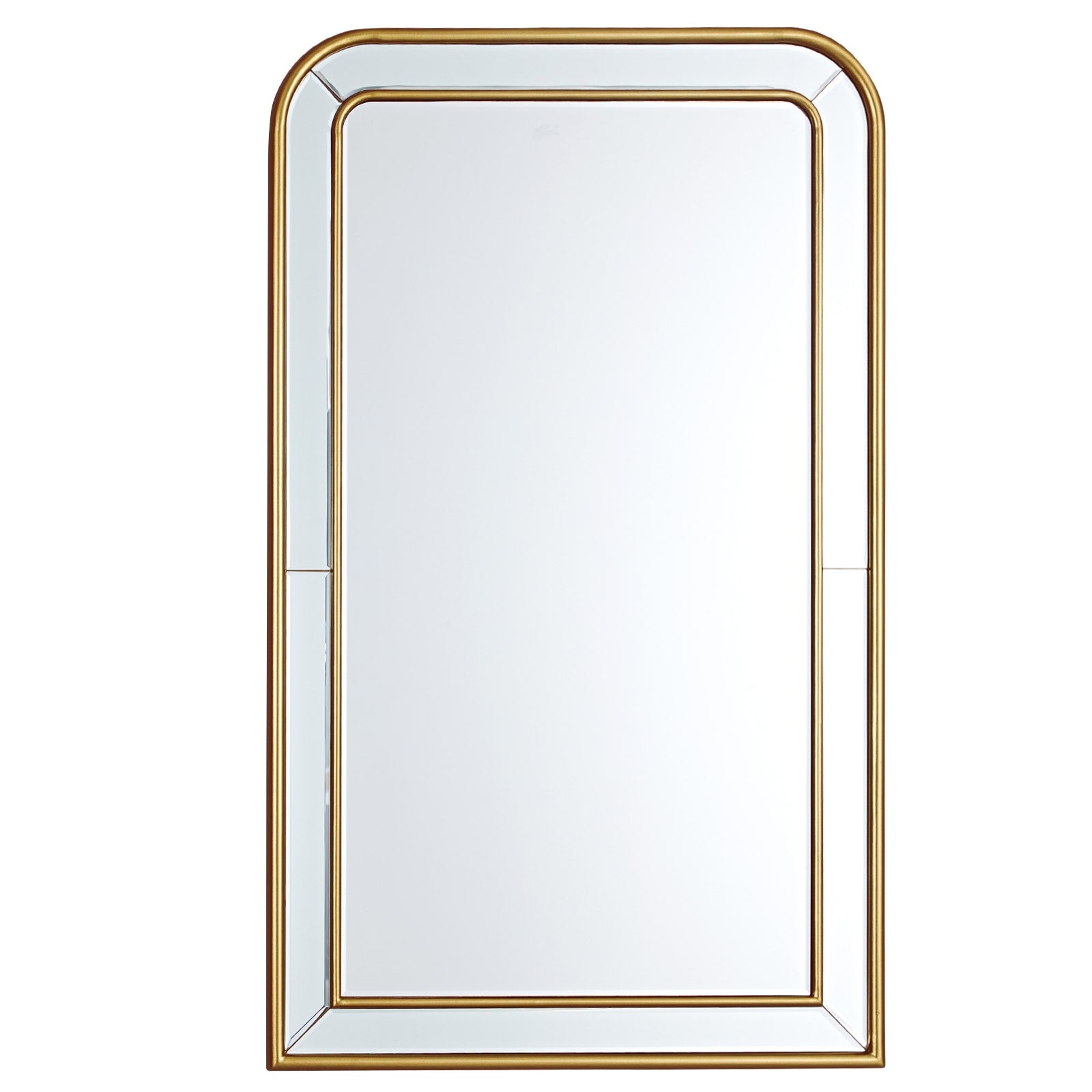 Introducing the Elena, an elegant arched 100x60 cm mirror featuring a stunning gold border that frames its reflective surface. The perimeter is designed with two layers: a sleek, polished gold trim on the exterior that adds a luxurious touch, and a more intricate, slightly textured gold border on the interior, which highlights the reflective glass. The combination of the two gold borders creates a striking contrast, giving the mirror a refined, sophisticated appearance. The mirror's design is timeless, making it a perfect addition to both contemporary and classic interior styles.