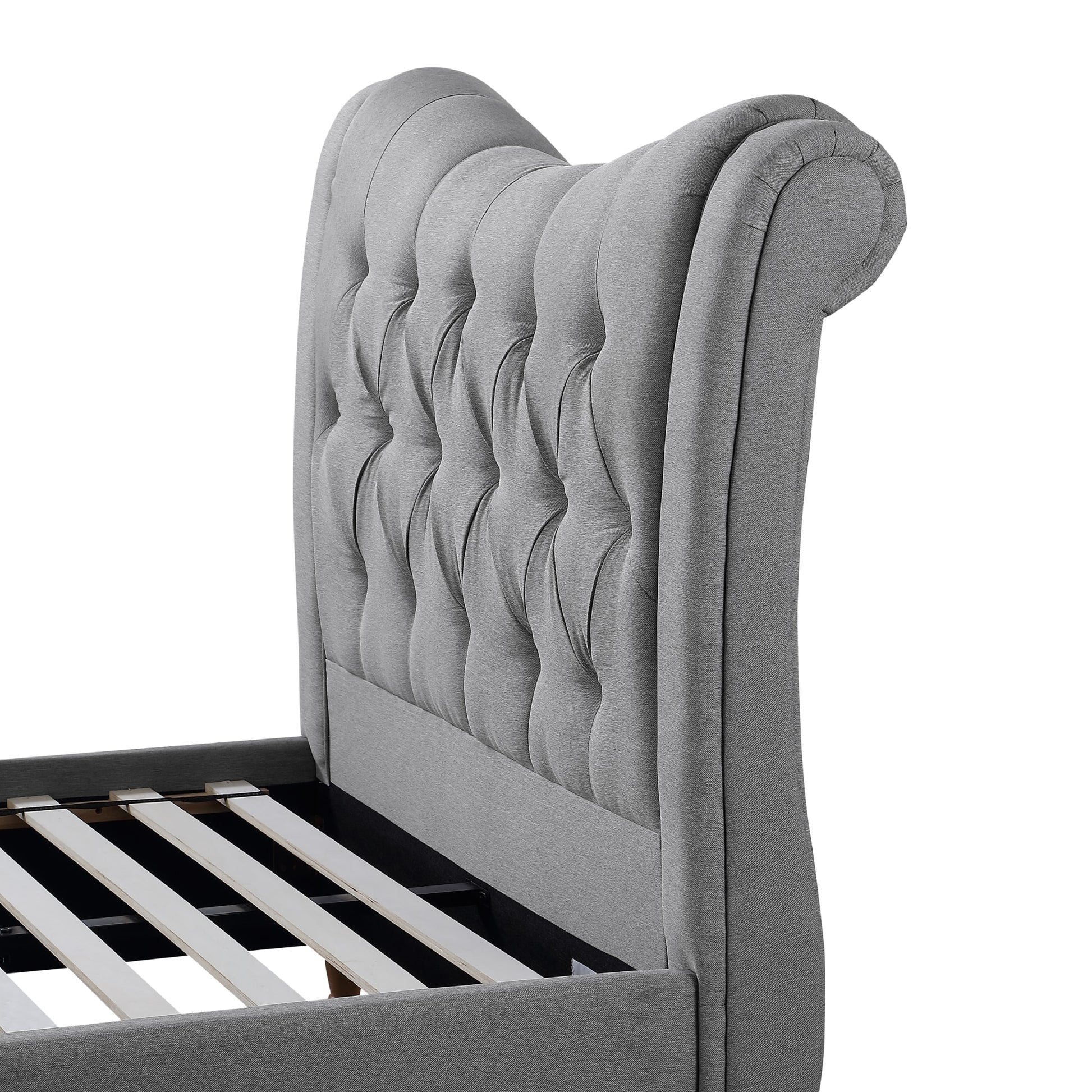 Transform your bedroom into a haven of elegance with the Kelvin Linen Bed. Dressed in luxurious grey fabric, this sleigh bed exudes sophistication. Its unique dipped headboard and footboard give it a distinctive aesthetic. The headboard, detailed with eye-catching button-back accents, adds texture and charm to your room.