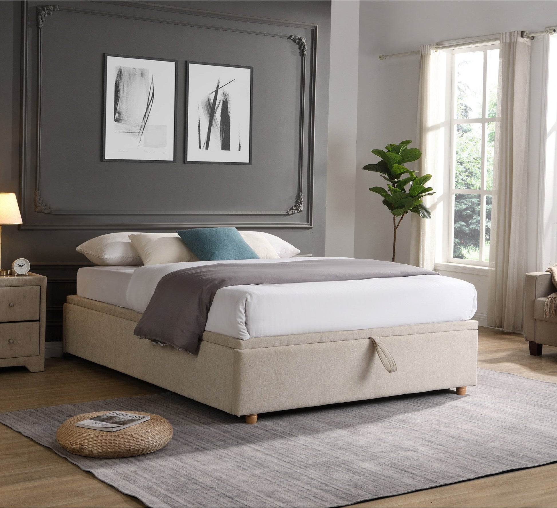 Experience our innovative Fabric Bed Base, combining style with practicality. This base boasts a gas-lift feature for hidden storage, standing on durable wooden feet. Open it effortlessly using the foot-end handle. Pair it with various headboards to suit your style. Upgrade your bedroom with stylish storage.